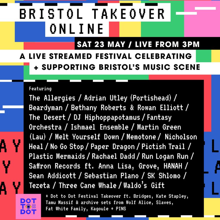 Hosted by BBC Introducing in the West presenters, Richard Pitt and Sam Bonham, Bristol Takeover Online will feature the likes of Adrian Utley (of Portishead), The Allergies, Ishmael Ensemble, Melt Yourself Down, No Go Stop, Pictish Trail, Rachael Dadd, Run Logan Run, Three Cane Whale, artists on the Saffron Records roster, and many more.