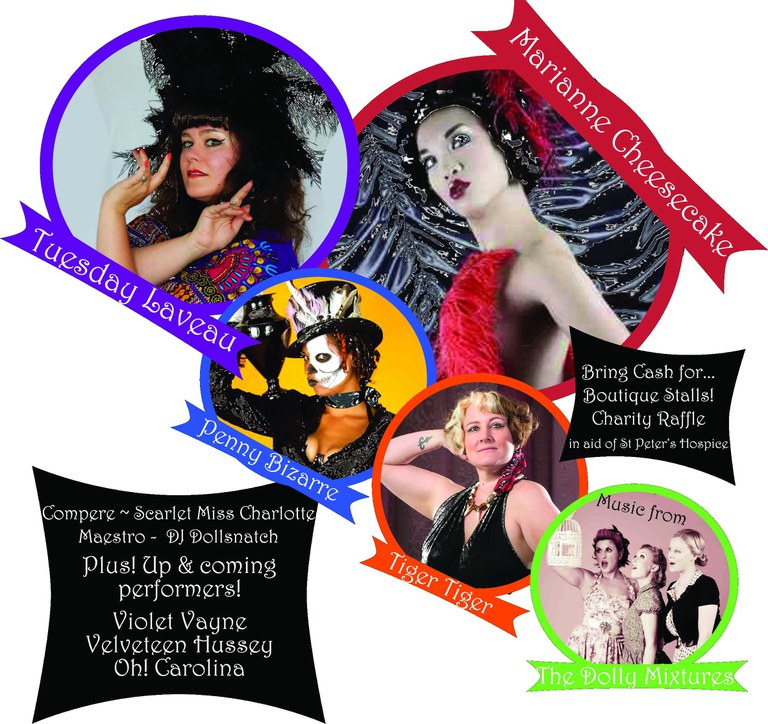 The show will feature burlesque striptease performers and cabaret singers including amazing international head-liner acts Tuesday Laveau and Marianne Cheesecake ; notorious new talent: Violet Vayne , Velveteen Hussey , Oh! Carolina ; and support acts: Tiger Tiger and Penny Bizarre