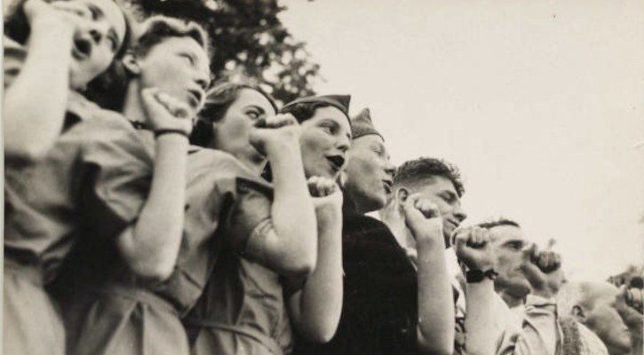 These photographs were taken on a break during rehearsals for production On Guard for Spain, and members of the Bristol Unity Players Club can be seen dressed up as Spanish republicans who they and everyone in this movement were in solidarity with during the Spanish Civil War (1936-1939).