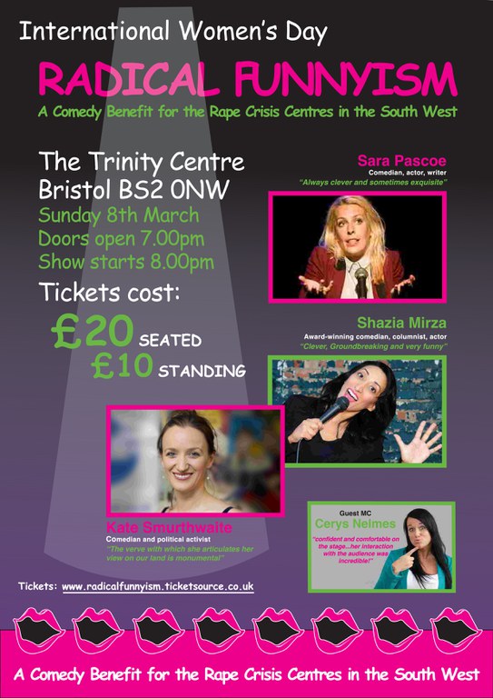 International Women's Day, Radical Funnyism is the first of its kind. A benefit night raising funds for all four rape crisis centres across the South west from Gloucestershire to Cornwall. The Show will feature top comedians including;