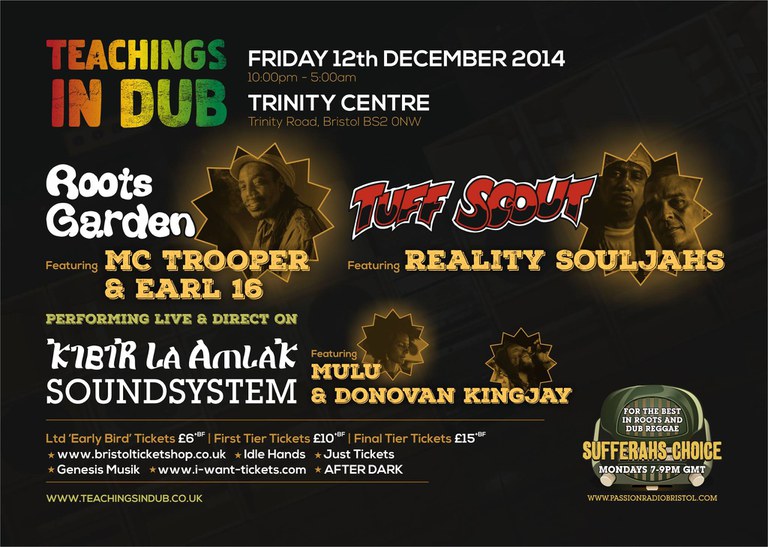 Of course there has to be a soundsystem or it wouldn't be Teachings in Dub! All acts will be performing live and direct on the mighty KIBIR LA AMLAK who will once again bring their beautiful hand built soundsystem into the Trinity Centre and shake the very foundations with Jah music. Blessing the mic for them will be the up and coming MULU whose performances on the sound have built her an instant name as the new roots daughter in town. Joining her will be the righteous sounds of DONOVAN KINGJAY who has been making big strides recently with some heavyweight releases and of course nicing up the dance very often with the great Channel One.