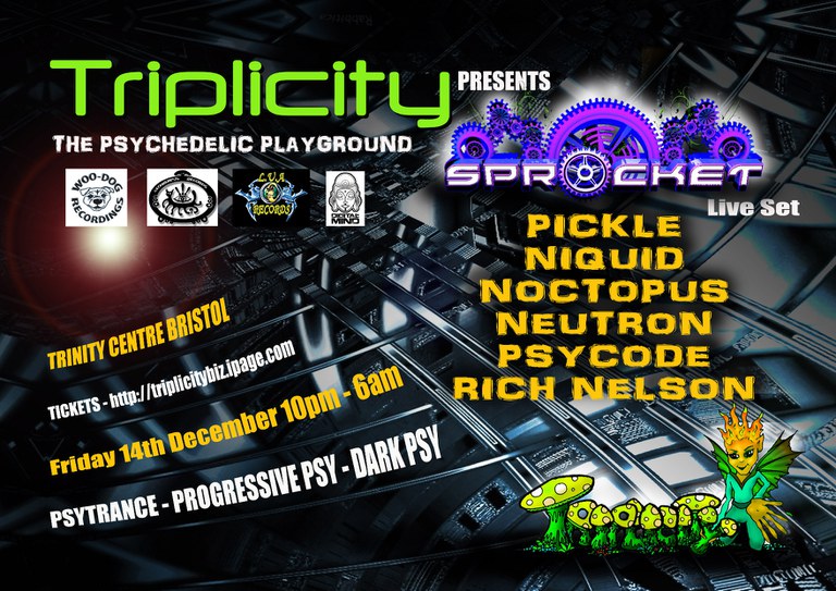 We will have the psychedelic playground in full festive force in the main hall with our decor and visuals creating the Triplicity party environment. There will be a chill out grotto for you to kick back between stomping sessions and the outside area will receive the Triplicity twist to complete the set up.