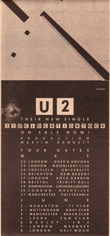 - U2 11 O'Clock Tick Tock Tour came to Trinity Hall, Bristol in 1980, supported by The Stingrays
