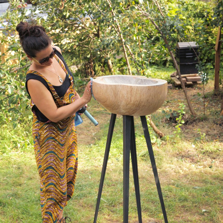 The Bird Bath is carved in Ancaster Weatherbed stone by artist Alice Cunningham